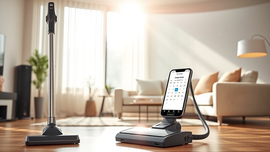 If you struggle with allergies, scheduling app-connected vacuums can be a game-changer for your home. These smart devices not only take the burden off your shoulders but also help maintain a cleaner, healthier environment. With their ability to run on a schedule, you can guarantee that your floors are regularly cleaned, reducing allergens like dust, pet dander, and pollen that contribute to your discomfort.