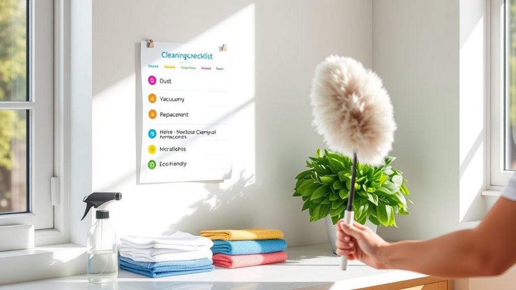 To create effective seasonal cleaning checklists for allergy sufferers, focus on tasks that reduce allergens each season. Spring is great for deep cleaning, washing curtains, and vacuuming with HEPA filters. Summer means keeping windows closed during pollen season and dusting often. Fall involves inspecting and replacing air filters and cleaning HVAC systems. Winter benefits from humidifying and regular dusting. Keep up with these routines year-round, and if you continue exploring, you’ll find expert tips to further improve your indoor air quality.
