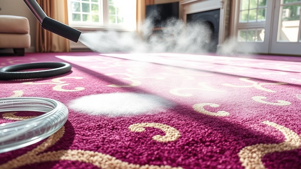 Steam cleaning is generally safe for most carpet fiber types, but you should check your carpet’s care label first. It’s a safe method when done properly, as it uses high-temperature steam to sanitize and deep clean without harsh chemicals. However, delicate fibers like silk might be damaged by the heat. Always guarantee steam cleaning safety by using the right equipment and settings for your specific carpet to avoid any damage.