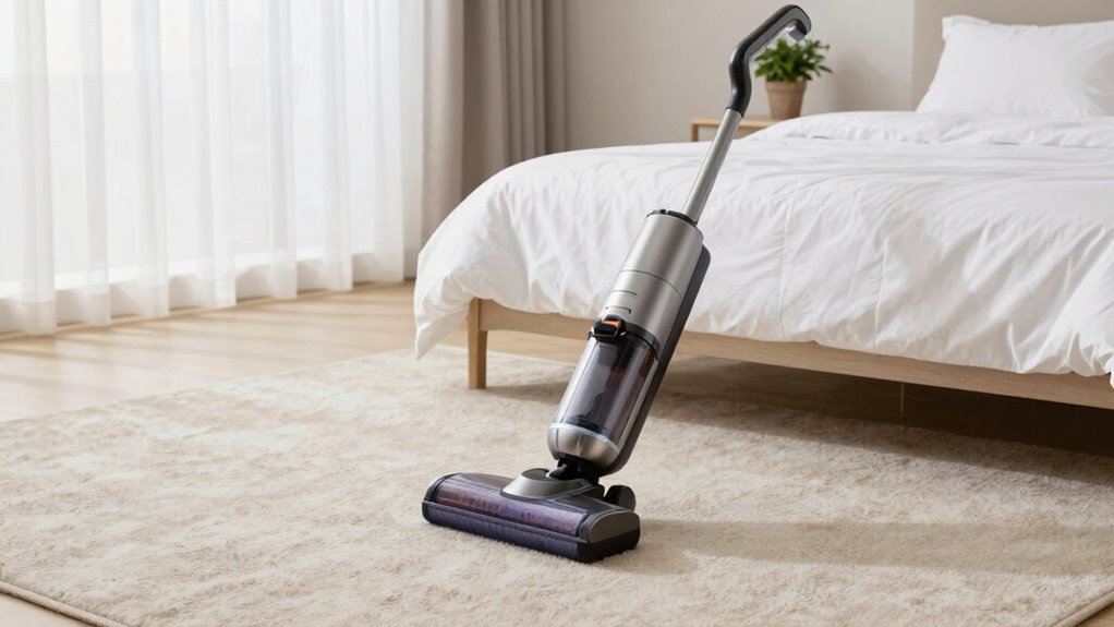 The best vacuum cleaner for bedrooms is a robot vacuum with HEPA filters. It effortlessly cleans floors and carpets, trapping allergens and dust mites that can disturb your sleep. Look for models with strong suction, good battery life, and HEPA filters to guarantee thorough allergen removal. This way, you maintain a cleaner, healthier sleep environment without much effort, helping you breathe easier and enjoy better rest nightly.