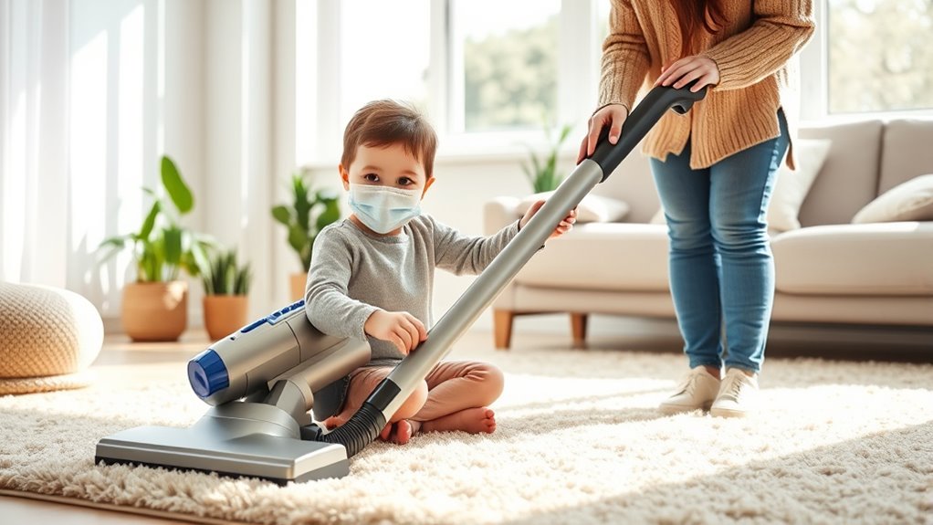 To safely vacuum with children who have asthma, use a vacuum with a HEPA filter and a sealed system to trap tiny allergens like dust mites and pet dander. Vacuum slowly and frequently—about once or twice a week—in high-traffic areas while wearing a mask if needed. Ventilate the space during and after cleaning to reduce airborne particles. For more tips on creating a safer environment for your child, keep exploring these strategies.
