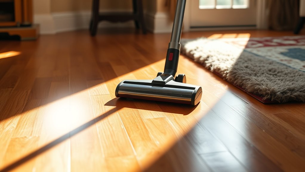 For hardwood floors, a vacuum with soft bristles is your best choice. Look for a model specifically designed for hard surfaces, as they provide excellent flooring protection. Regular vacuum maintenance is key—empty the dustbin often and check filters to guarantee maximum performance. You’ll also want to avoid vacuums with beater bars, which can scratch your beautiful floors. Investing in the right vacuum can help keep your hardwood looking pristine for years!