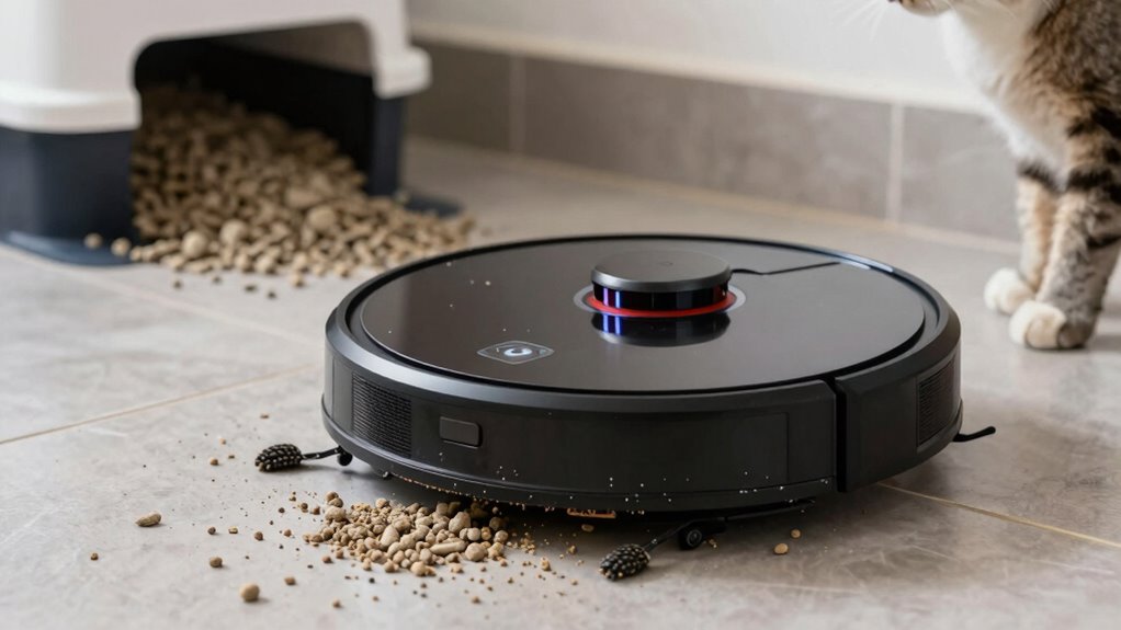 The combination of cluttered sensors and uneven surfaces makes it tricky for robot vacuums to do their job effectively. They’re designed to handle typical dirt and dust, but the fine particles from litter are a different story. Litter can hide in corners, underneath furniture, or get lodged in the vacuum’s brushes and wheels, causing further mechanical issues. Plus, if the litter isn’t cleared away regularly, the vacuum may interpret it as an obstacle, leading to frequent stops or reroutes. To improve performance, you’ll want to stay on top of cleaning your vacuum’s sensors, vacuuming the area around the litter box more frequently, and maintaining a clean, litter-free zone. This way, your robot vacuum can navigate more smoothly, avoid getting stuck, and do a better job keeping your floors clean.