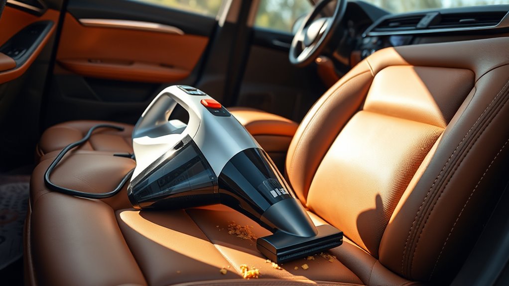 Cleaning your car interior with portable vacuums is quick and effective. You can easily reach tight spaces and eliminate dust, crumbs, and allergens wherever you are. Regular vacuuming not only preserves your vehicle’s appearance but also guarantees a hygienic environment for passengers. Plus, it’s a simple way to maintain that fresh, inviting feel inside your car. Keep your interior looking and smelling like new—discover more tips to enhance your car cleaning routine!