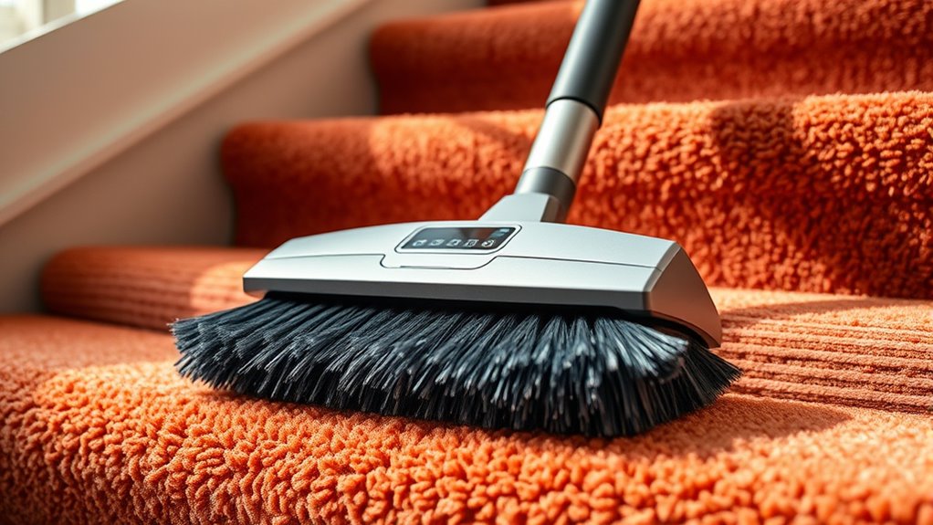 Periodically, stop to check the brush head for tangled hair or fibers that may hinder performance. Removing these obstructions keeps the brush spinning freely, maintaining its cleaning power. Also, keep an eye on the brush’s bristles; over time, they can become worn or bent, reducing their ability to lift dirt. Replacing or rotating brush heads when necessary ensures your power brush continues to work efficiently. With proper vacuum maintenance and the right brush head type, your carpeted stairs will look cleaner, and you’ll extend the life of your equipment. Regular cleaning combined with attention to these details makes the task less daunting and guarantees a more thorough, satisfying result.