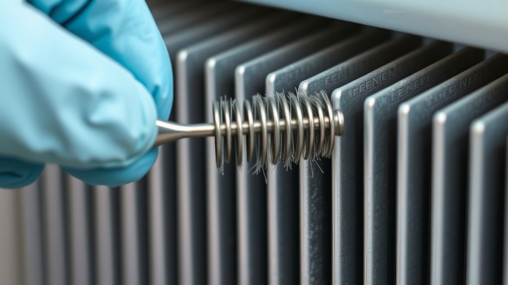 Using a radiator and coil brush is essential for keeping your radiator fins and refrigerator coils clean. Gently insert the brush between fins or coils to remove dust, dirt, and debris that block airflow and heat transfer. Regular cleaning improves efficiency, reduces energy bills, and prolongs appliance life. If you want to learn more about the proper techniques and benefits of this simple maintenance, keep exploring for helpful tips and insights.