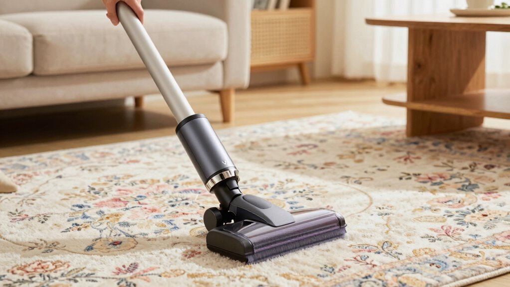 You should definitely use specific vacuum settings for delicate fibers; otherwise, your rug might suffer more than a superhero’s worst nightmare. Adjust the suction to a gentle level and activate fiber protection if available. This prevents damage and keeps your delicate rug looking vibrant. Always opt for low or no beater bar settings, and double-check your vacuum’s manual to guarantee you’re giving your fibers the gentle care they deserve.