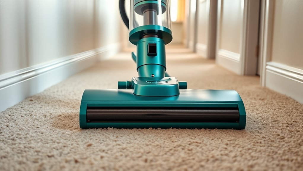 You need a new vacuum when it no longer maintains proper suction, making vacuum maintenance ineffective. If you notice persistent clogging or strange noises, it’s a sign to replace it. Over time, worn brushes and filters can harm carpet longevity, so upgrading guarantees better cleaning. Regularly check your vacuum’s performance; if repairs become frequent or costly, investing in a new model will keep your high-traffic areas cleaner and your carpets in top shape.