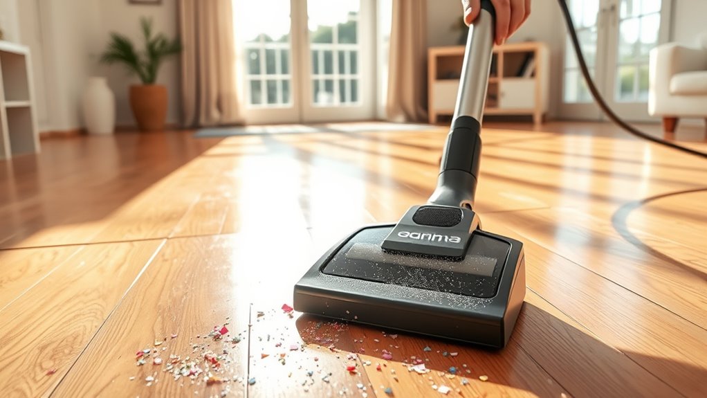 Imagine you’re cleaning your hardwood floors and notice dust and crumbs piling up after a few days. For hardwood floor care, you should vacuum at least twice a week, especially in high-traffic areas. A consistent vacuuming schedule prevents dirt buildup and keeps your floors looking pristine. Regular vacuuming not only maintains your hardwoods’ beauty but also extends their lifespan, making your cleaning routine both effective and efficient.