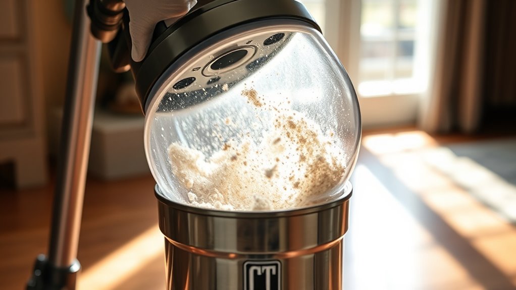 To safely empty your bagless vacuum bin, first turn it off and unplug it. Wear a mask and goggles, then take the bin outside. Open it slowly over a trash bag to catch any dust without creating a cloud. Avoid shaking it, and if needed, break apart large clumps with gloved hands. After emptying, check your filters and clean them according to the manufacturer’s instructions. Stick around, and you’ll find more tips on maintaining a hygienic vacuuming routine.