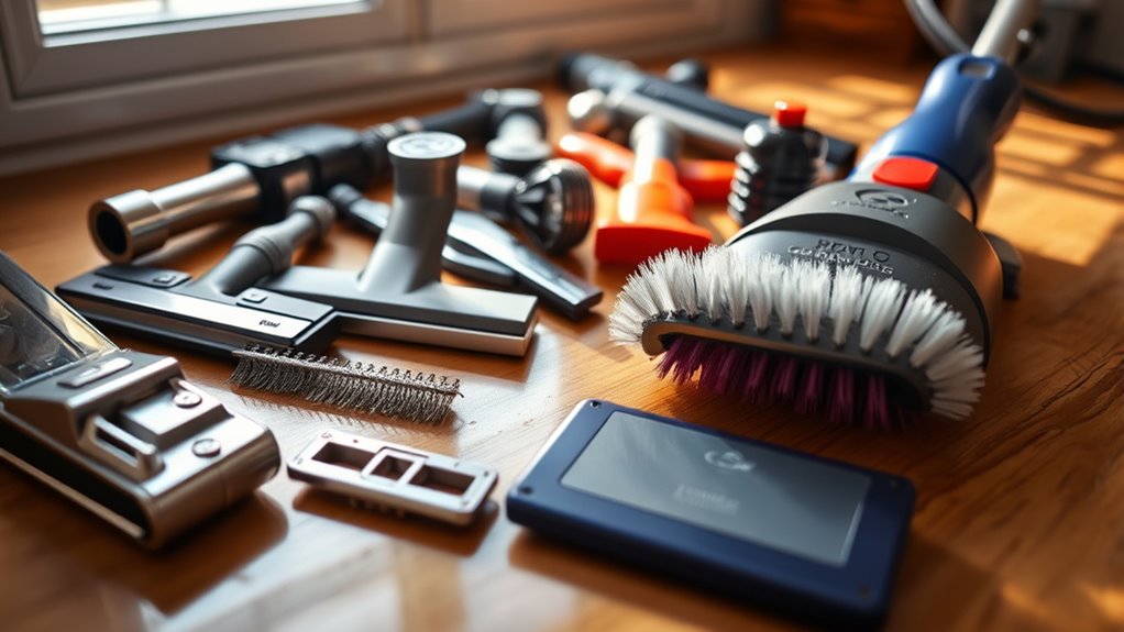 To maintain your vacuum attachments, regularly inspect for clogs, frayed bristles, and cracks. Rinse brushes and filters under running water, allowing them to dry completely before reattaching. Use the correct attachments for specific surfaces, which enhances cleaning efficiency. Also, keep a cleaning schedule to guarantee peak performance and longevity. By taking these simple steps, you can keep your vacuum attachments in top shape and ready for any cleaning challenge that comes your way. You’ll soon discover even more helpful tips!