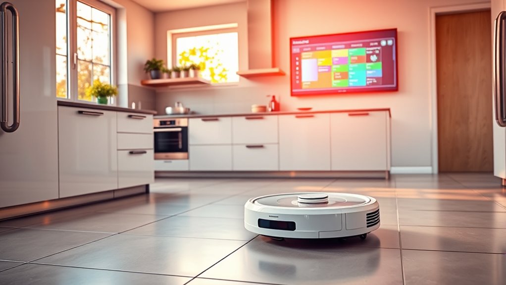 AI prioritizes cleaning tasks through task prioritization algorithms and routine learning. It analyzes your habits, schedules, and specific needs to determine which areas need cleaning first, ensuring efficiency. By continuously learning your routine, it adapts its schedule, focusing on high-traffic zones or areas that need more attention. This dynamic approach helps you maintain a cleaner space with minimal effort, as the AI intelligently manages tasks based on your lifestyle.