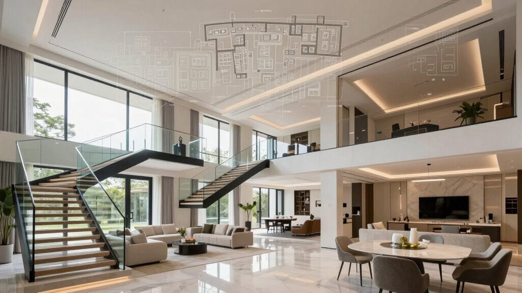 Think of multi-floor mapping as your home’s digital skeleton. It uses advanced indoor navigation and 3D modeling to create a detailed map of every nook and cranny. Laser scanners, LiDAR sensors, and cameras work together, capturing precise data across floors. This tech transforms your home into a navigable landscape, ensuring your smart systems and security tools understand every corner, making your bigger home safer and smarter.