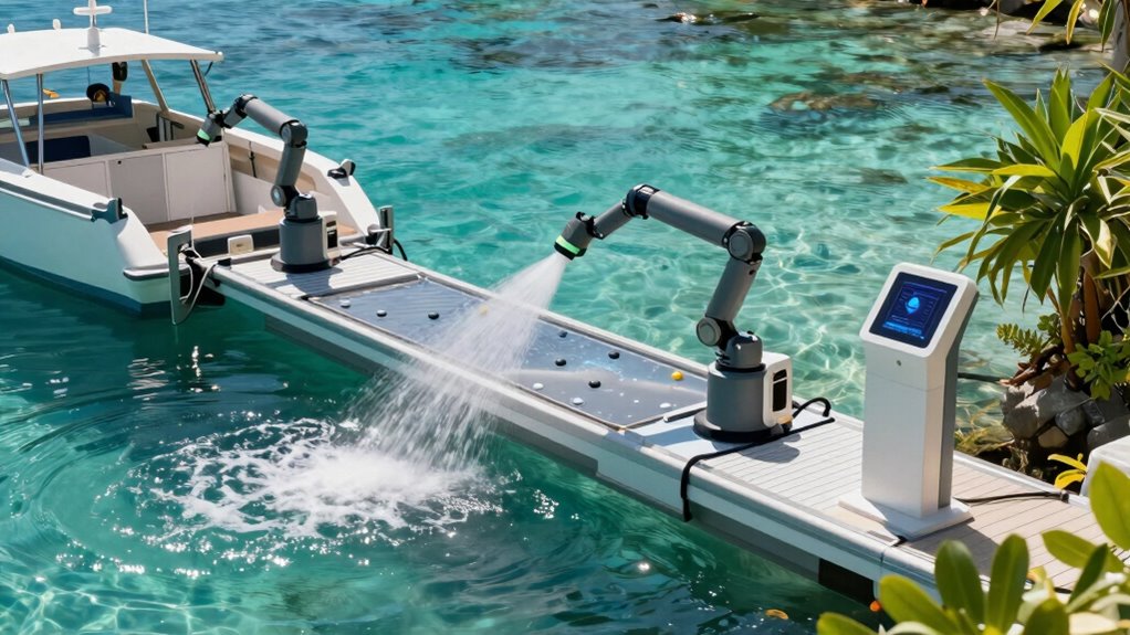 Environmental impact is another essential aspect these systems address. Traditional boat cleaning often involves high-pressure hoses and chemical cleaners that may harm aquatic ecosystems if not used responsibly. Self-washing docks are designed with eco-friendly features, such as water recycling and biodegradable cleaning agents, to minimize environmental footprint. They reduce water waste by recycling rinse water and limit chemical runoff that could contaminate nearby waters. This means your boat gets clean without contributing to pollution or harming delicate marine habitats. It’s a sustainable solution that aligns with efforts to protect the environment while keeping your vessel in top condition.