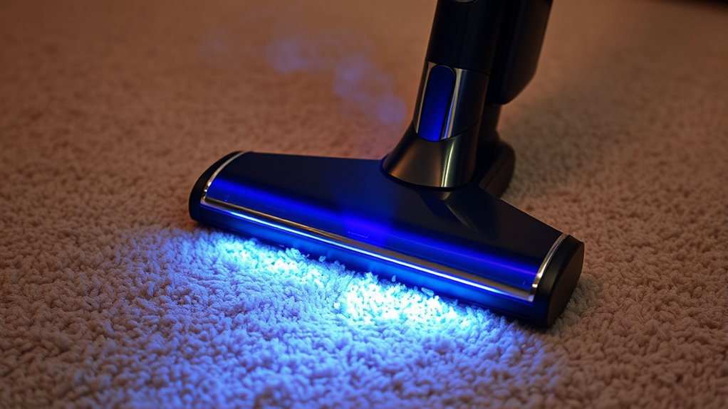 UV sanitization in vacuums works by using ultraviolet light to target and destroy germs, viruses, and mold spores at the molecular level during cleaning. As you vacuum, the UV light penetrates hard-to-reach areas, killing microbes and improving air quality. This technology offers a safer, deeper clean without chemicals or filters, actively reducing bacteria and viruses in your home. Interested in how this innovative feature can make your cleaning more effective? Keep exploring to find out more.