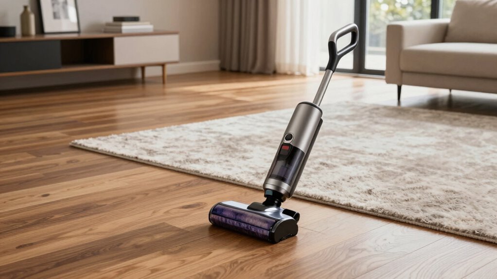 When choosing your cordless vacuum, pay attention to its brush system. A vacuum with a multi-surface brush roll can adapt to various floor types, picking up dust, pet hair, and debris efficiently. Additionally, lightweight designs make maneuvering across different surfaces easier, reducing fatigue and allowing you to reach tight spaces or under furniture comfortably. Some models include smart sensors that automatically detect surface changes and adjust suction accordingly, saving you time and effort. Incorporating advanced surface detection technology can further enhance cleaning efficiency across diverse flooring. Moreover, selecting a vacuum with effective filtration can help improve indoor air quality by trapping allergens and fine dust particles. Investing in a vacuum with durable parts can also prolong its lifespan, ensuring consistent performance over time.