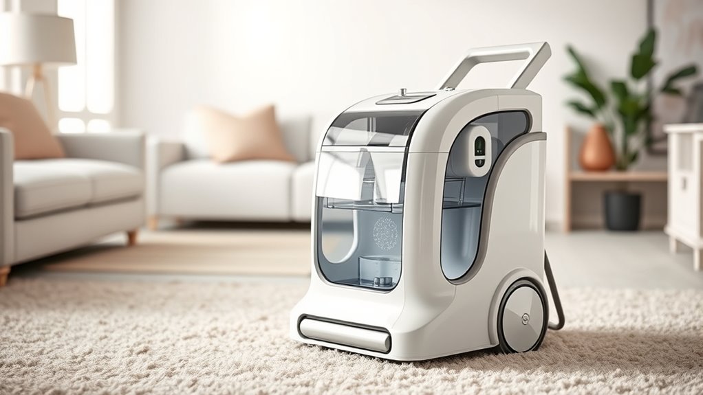 Choosing the right all-in-one carpet cleaner and dryer involves more than just looking at the sticker price; it’s important to contemplate the long-term costs and coverage. I recommend comparing the initial purchase price with ongoing expenses for cleaning solutions and accessories to determine true value. Checking the manufacturer’s warranty is essential—most range from 1 to 5 years—and understanding what it covers helps avoid surprises. Models with longer warranties often offer more extensive protection, saving you money on repairs down the line. Also, verify the availability of customer support and service centers in case repairs or troubleshooting are needed during the warranty period. Ultimately, investing in a machine with a solid warranty and good support can make your cleaning routine more cost-effective and stress-free.