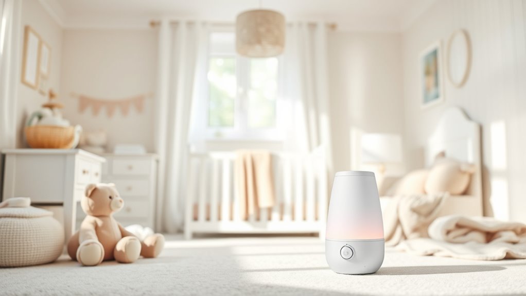 I look for humidifiers with automatic shut-off to prevent over-humidifying and reduce safety risks. A filterless design makes cleaning easier and avoids mold buildup. I also prioritize models with cool mist technology to prevent burns or injuries. Quiet operation is essential so I can keep my baby comfortable and asleep. Finally, I check for BPA-free materials to ensure safe, non-toxic use around my little one.