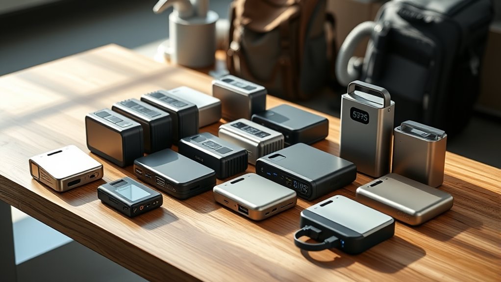 Choosing the right battery backup for travel means balancing portability with power capacity. Lighter batteries, usually under 3 pounds, are easier to carry and ideal for frequent travelers. However, they often offer lower capacity, so you might need to recharge more often. Compact size is essential for fitting within carry-on luggage and meeting airline regulations, typically under 100Wh or 160Wh. Larger, higher-capacity batteries tend to be bulkier and heavier, which can make travel less convenient. The overall dimensions should allow easy packing without causing discomfort or taking up too much space. Finding the right balance between weight and capacity guarantees you have enough power for your CPAP machine while keeping your travel setup manageable and comfortable.