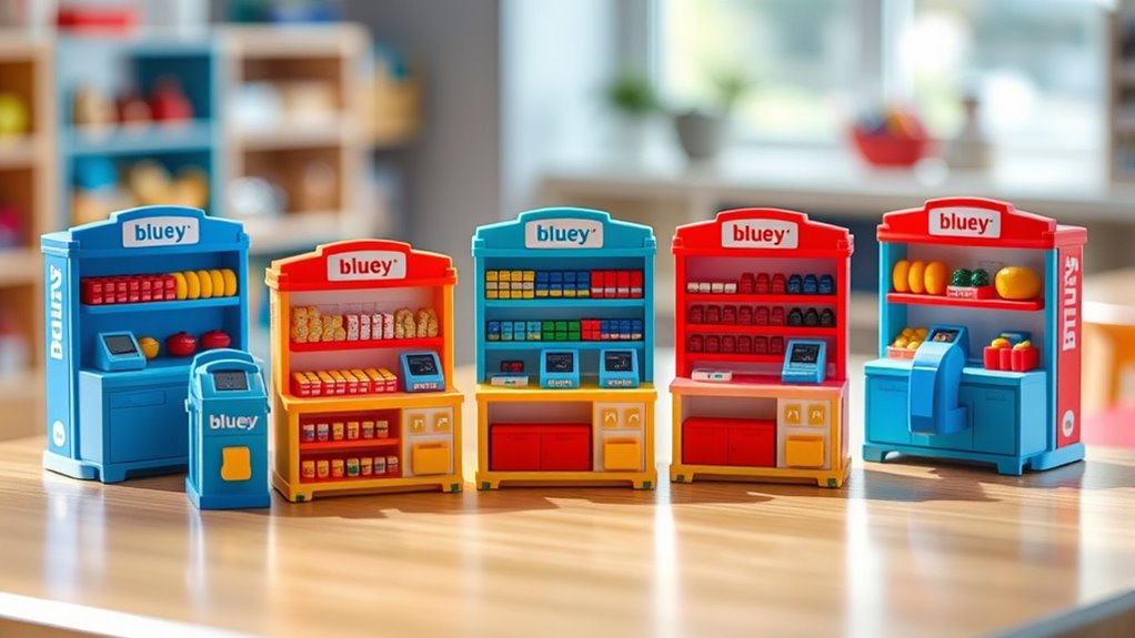Have you considered how the accessories included with a Bluey supermarket playset can impact its overall value and playability? Accessories like pretend food, cash registers, shopping baskets, and reusable bags boost imaginative play and make the experience more engaging. Check if the set offers extra pieces such as play money, coupons, or themed props, which can expand role-playing options. Compatibility with other Bluey figures and playsets is also key for seamless integration and varied scenarios. Look for accessories that develop fine motor skills, like small utensils or buttons, to add developmental benefits. Lastly, confirm these extras are durable, safe, non-toxic, and long-lasting, so they withstand active play and provide ongoing fun for your little one.