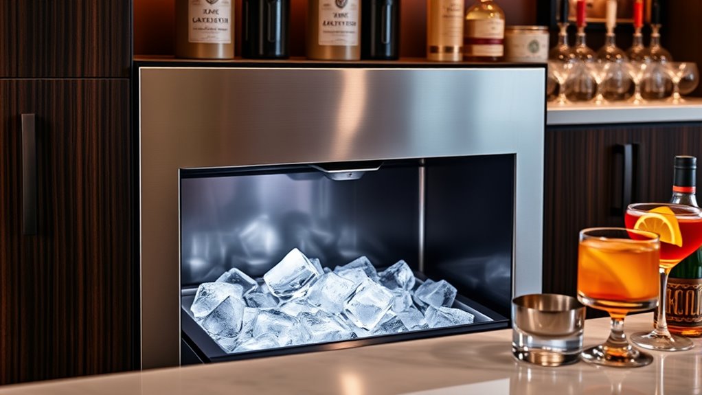 The type of ice your built-in ice maker produces can considerably influence how you enjoy your beverages. Different ice types cater to various preferences, from clear, elegant cubes to soft, chewable nuggets. Clear cubes are great for presentation and longer-lasting chill because they melt more slowly. Crescent-shaped and pebble or nugget ice are softer and ideal for cocktails or blended drinks, offering a pleasant chew. Some models let you customize ice cube sizes and thickness, tailoring the experience to your liking. Keep in mind, the ice type can also impact maintenance—certain forms may require specific cleaning routines or descaling. Choosing the right ice type ensures your drinks stay perfectly chilled and match your style, whether you value aesthetics, functionality, or both.