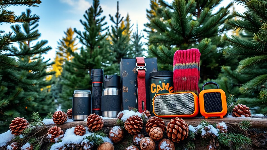 Looking for perfect camping gifts for men this holiday season? I recommend a Garmin Edge 1050 for navigation, a versatile foot massager for recovery, and the Bartesian cocktail machine for fun drinks outdoors. For sweet treats, the Ninja CREAMi offers endless options, while the Ninja Luxe Café makes brewing coffee a breeze. Keep exploring to find out more about these top picks and make your gifts truly stand out.