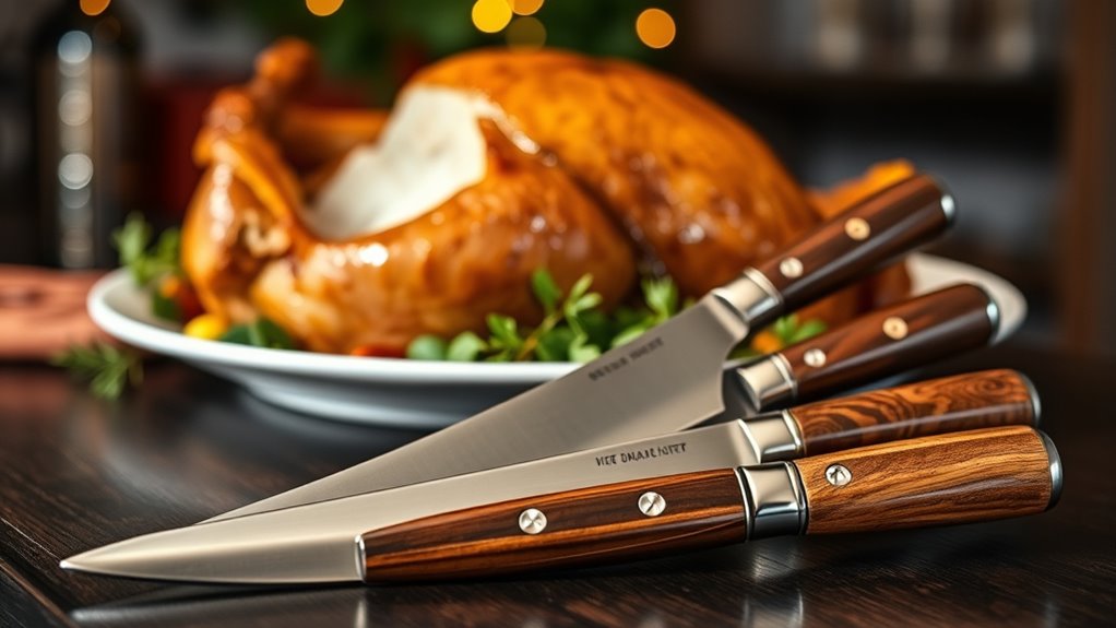 So, whether you’re slicing like a knight of the Renaissance or simply aiming for that perfect holiday turkey, choosing the right carving set makes all the difference. Remember, a quality knife is your trusty Excalibur in the kitchen, ensuring every carve is smooth and precise. Don’t settle for less—your feast deserves the best. After all, even in the age of smartphones, a sharp knife remains timeless for creating memorable holiday moments.