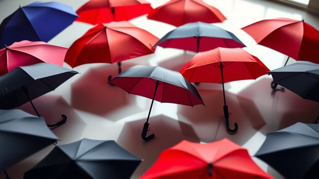Durability is key when it comes to compact travel umbrellas, especially since they face frequent use and unpredictable weather. I look for umbrellas with reinforced fiberglass ribs and high-quality materials like aluminum or steel, which can withstand strong winds and heavy rain. The canopy fabric should have waterproof coatings such as Teflon or polyurethane for quick drying and long-lasting water resistance. Materials like fiberglass or reinforced polymer in the frame and ribs offer flexibility and strength, preventing inversion or breakage during storms. Lightweight metals like aluminum help keep the umbrella portable without sacrificing resilience. Additionally, well-constructed joints and reinforced shafts ensure the umbrella can endure consistent use and harsh conditions. Choosing the right materials guarantees a reliable, long-lasting travel companion.