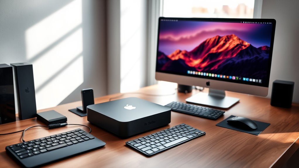 When choosing a compact workstation Mac, considering how well it integrates into the Apple ecosystem is crucial, as seamless compatibility enhances overall productivity. A Mac that works effortlessly with your iPhone, iPad, and other Apple devices streamlines workflows and reduces setup time. Features like iPhone mirroring, cross-device copy-paste, Messages, and FaceTime become more accessible, making communication and multitasking smoother. Supporting the latest macOS updates ensures you can take full advantage of new ecosystem features and security improvements. Compatibility with Apple accessories such as external displays, keyboards, and peripherals also boosts efficiency. Ultimately, selecting a Mac that syncs effortlessly across devices minimizes interruptions, keeps data consistent, and maximizes your workflow within the Apple ecosystem.