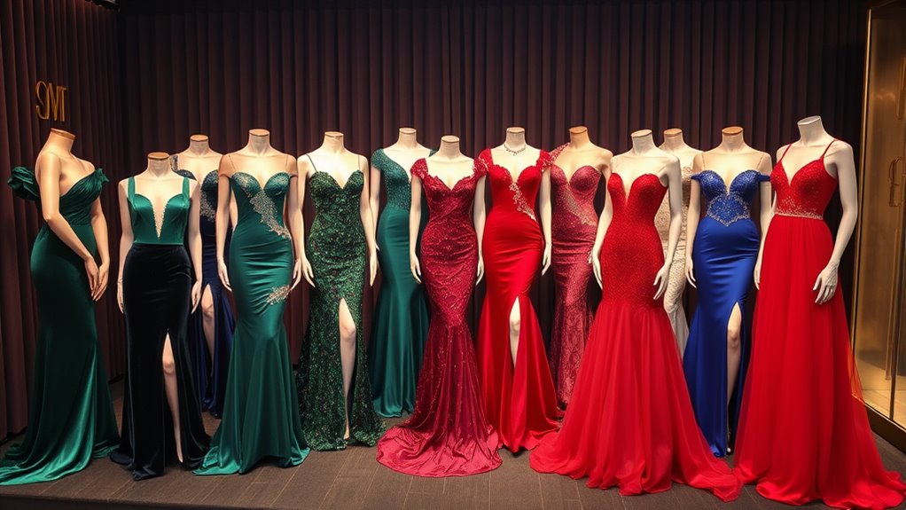 If you’re looking to shine at any event, I recommend exploring these top designer evening gowns. From luxurious velvet with illusion sleeves to elegant jacquard and ruffled maxi dresses, each option offers a perfect blend of style and sophistication. These gowns feature flattering silhouettes, eye-catching details, and high-quality fabrics that make any woman stand out. Keep exploring to find out which stunning gown best complements your look and makes you feel confident.