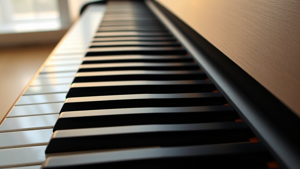 The key action and feel of a digital piano play a essential role in shaping your playing experience, as they determine how responsive and expressive the instrument is. Weighted keys mimic the resistance of acoustic piano hammers, offering a realistic touch that benefits serious players aiming for authenticity. Semi-weighted keys strike a balance, making them ideal for beginners or casual musicians who want some feel without the heaviness. The feel of the keys, including their sensitivity and response time, affects your ability to perform dynamics and nuances effectively. Graded hammer action takes this a step further by making the lower keys heavier and the higher keys lighter, closely replicating an acoustic piano’s touch. Choosing the right key action can greatly enhance your overall playing satisfaction.