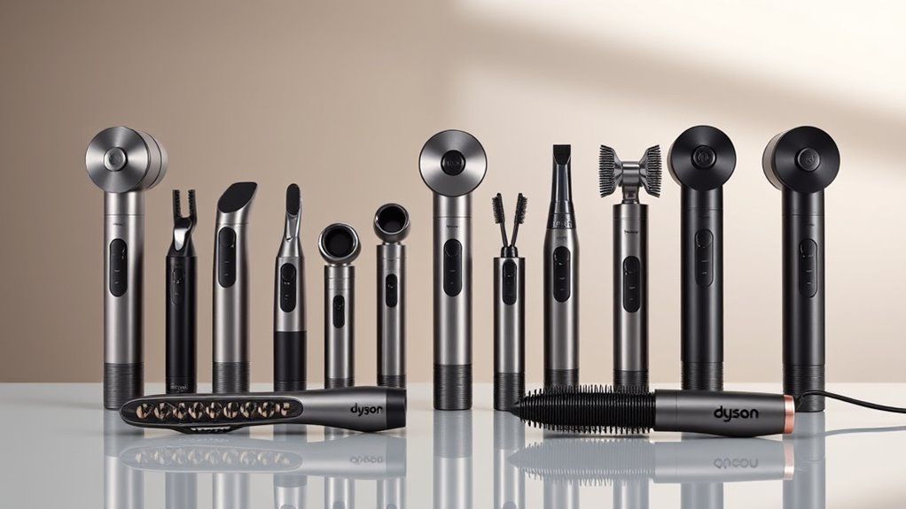 If you’re looking to upgrade your hair game, I recommend checking out the 13 best Dyson styling tools. From versatile options like the Dyson Airwrap™ and Dyson Airstrait™ to the compact Shark HD430 FlexStyle, these tools combine powerful airflow, advanced heat control, and multiple attachments for every style. Each is designed for ease, safety, and great results. Keep exploring, and you’ll discover which one best fits your hair needs and styling goals.