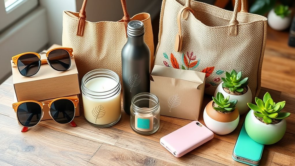 Personalization options can transform an eco-friendly gift from a simple item into a meaningful keepsake. Engraving, custom messages, or unique designs add sentimental value and make the gift feel special. For example, an engraved wooden cutting board or a personalized seed calendar creates lasting memories and deepens emotional connections. Many sustainable products offer customization choices to match the recipient’s preferences or the occasion, making the gift truly one-of-a-kind. Adding personal touches elevates basic eco-friendly items into heirlooms that can be treasured for years. By choosing gifts with customizable features, you *guarantee* they’re not only eco-conscious but also unique and memorable, reflecting the recipient’s personality or celebrating meaningful milestones. Personalization truly enhances the thoughtfulness behind sustainable gift-giving.
