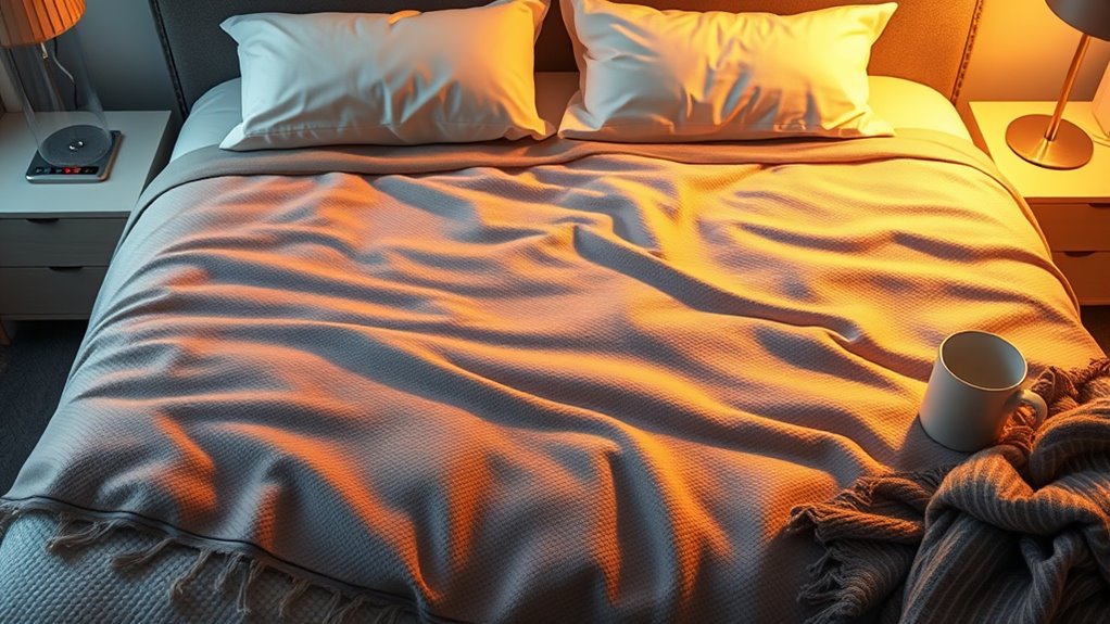 A user-friendly control panel can make all the difference when managing a king-size dual control electric blanket. I look for clearly labeled buttons or dials that make adjusting temperature settings straightforward. Digital displays with backlit or dimmable screens are a bonus, helping me see settings easily even in low light. Tactile feedback, like clicks or vibrations, reassures me that my selections are registered without guesswork. For dual controls, separate panels for each side allow personalized comfort, which is a game changer. Lightweight, ergonomic controllers with simple interfaces also enhance the experience, reducing confusion and making adjustments quick and intuitive. Ultimately, an easy-to-use control panel guarantees I stay cozy without frustration or hassle.