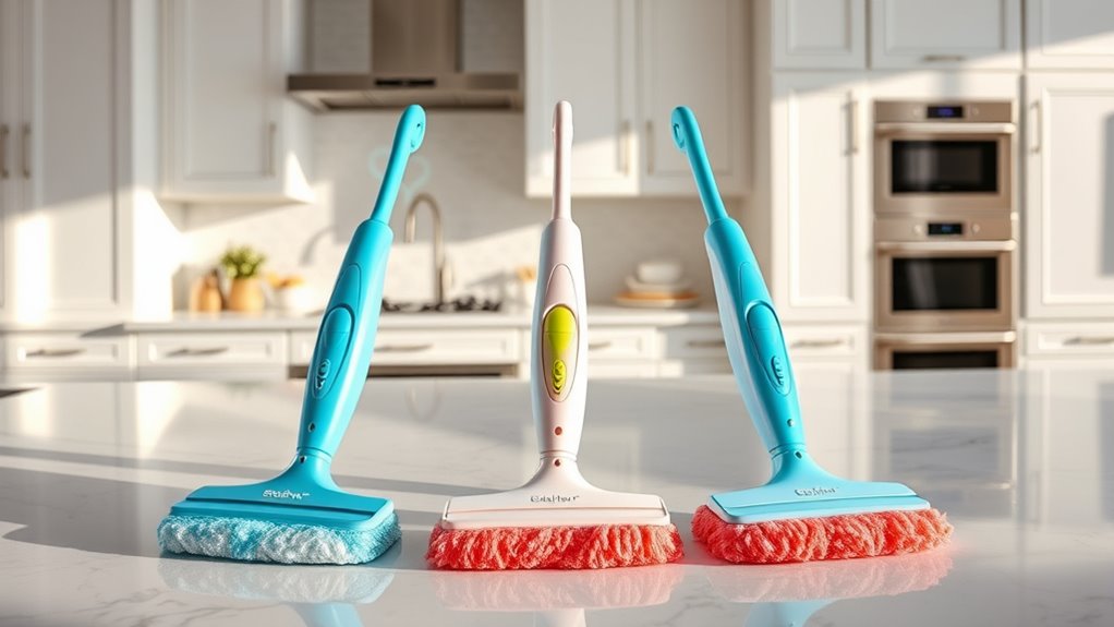 A wide range of brush heads considerably boosts a spin scrubber’s cleaning capabilities by allowing me to tackle various surfaces and problem areas effectively. Different brush shapes, like flat, pointed, or corner brushes, help me access tight spaces and hard-to-reach spots more easily. Specialized heads are great for specific tasks, such as cleaning grout, delicate surfaces, or corners. Interchangeable brush heads make the scrubber more versatile, reducing the need for multiple tools and streamlining my cleaning routine. High-quality scrubbers often come with several brush heads to suit different surfaces and cleaning intensities. Plus, replaceable or recoverable heads extend the lifespan of the device and keep it performing at its best, ensuring I get thorough cleaning with less hassle.
