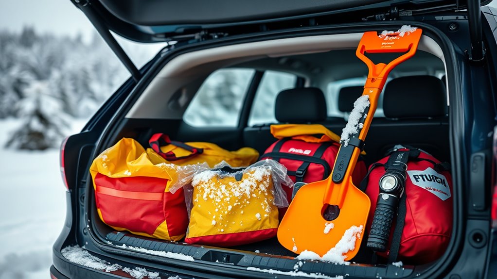 I’ve checked out the 14 top emergency car kits ideal for snowy conditions, and they include essentials like jumper cables, snow shovels, traction mats, and thermal blankets. These kits are packed with weather-resistant tools designed for cold, icy weather to keep you safe and mobile. Whether you need help starting your car, clearing snow, or signaling for help, these options have you covered. Keep going to discover more about choosing the best kit for your winter journeys.