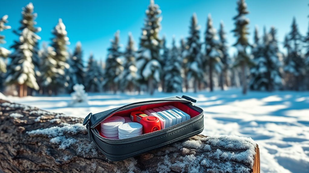To keep my first aid kit functional in freezing temperatures, I always store it in a insulated, waterproof container to protect it from cold and moisture. I check the batteries regularly, especially for items like LED flashlights or electronic devices, and I keep some hand warmers nearby to prevent freezing. Additionally, I make certain all medications are stored in a temperature-controlled spot, so they stay effective during my winter adventures.