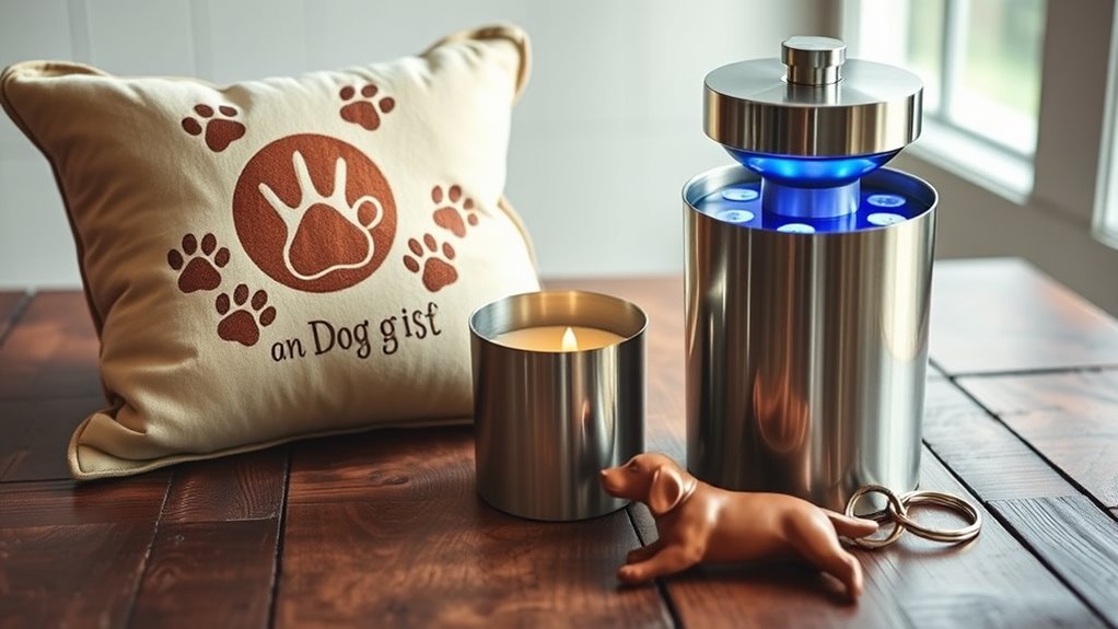 Selecting the right dog-themed gift depends heavily on the occasion, as different events call for different tones and styles. For holidays, festive or decorative items like ornaments or themed home decor work well, while sentimental gifts suit special milestones like pet birthdays or anniversaries. Consider the recipient’s age and familiarity with dog-related items—some may appreciate practical accessories, while others prefer heartfelt keepsakes. The event’s formality also matters; humorous accessories can add fun to casual celebrations, whereas elegant items suit more formal occasions. Above all, confirm the gift’s theme and tone match the event’s spirit—cheerful for holidays, heartfelt for appreciation moments. Matching the gift to the occasion guarantees it feels thoughtful and appropriate, making your present truly memorable.