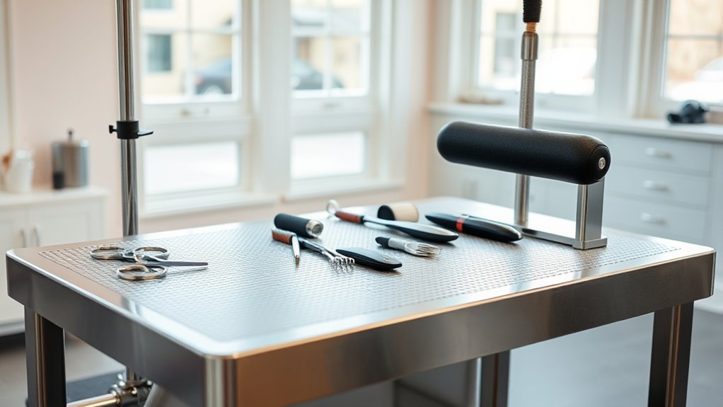 When choosing a grooming table, I look for safety features like sturdy, non-slip surfaces to prevent slips and falls. I also prioritize tables with adjustable arm restraints and secure clamps to keep my pet steady. A non-slip footing and rounded edges are essential for comfort and safety. Additionally, I prefer tables with a strong, stable frame to prevent wobbling, ensuring my pet stays safe and secure during grooming.