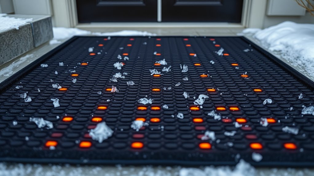Heated outdoor entry mats are surprisingly energy-efficient, especially when you choose models with adjustable settings and good insulation. I’ve found that they use minimal electricity, and since they focus heat only where needed, they don’t rack up high energy bills. Plus, they help keep snow and ice at bay, reducing the need for constant shoveling or de-icing. Overall, they’re a smart, eco-friendly way to stay warm and dry at your doorstep.