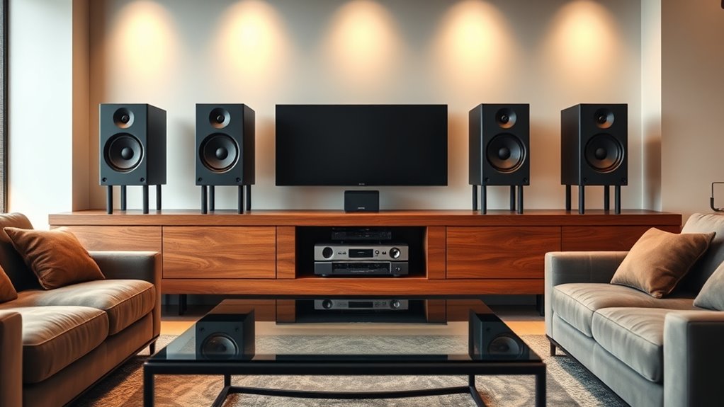 Choosing a hi-fi speaker system isn’t just about size and placement; it’s also about the features that let you customize your listening experience. Look for multiple sound modes like Movie, Music, Voice, Sport, and Night, which optimize audio for different settings. EQ presets, adjustable via remote or app, let you tailor sound profiles to your preferences or specific content. Surround sound modes like Dolby Atmos or DTS:X enhance spatial audio, creating immersive experiences. Some systems offer bass boost, treble adjustments, or fine-tuning options, helping you optimize sound quality across genres. Wireless connectivity options such as Bluetooth, Wi-Fi, or app controls make switching between modes seamless and enable easy integration with other devices. These features ensure your system adapts perfectly to your environment and listening style.