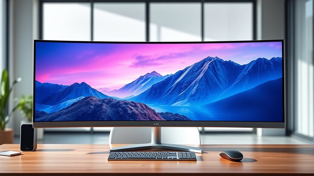Choosing a monitor with excellent color accuracy and a wide color gamut is essential for *guaranteeing* your work looks precise and vibrant. High-end 4K monitors often cover 99% sRGB, 93% DCI-P3, or higher, delivering rich, true-to-life colors. Many professional models support 10-bit color depth, offering over a billion colors that enable smooth gradations and minimize banding. Accurate calibration and factory presets ensure consistent performance across units. Support for HDR standards like HDR10 or VESA DisplayHDR 400/600 enhances contrast and color accuracy for high-dynamic-range content. Low ΔE values, typically below 2, indicate minimal color deviation from the source, *guaranteeing* your work remains accurate. Prioritizing these features helps create a reliable, vibrant display suited for detailed, color-critical tasks.