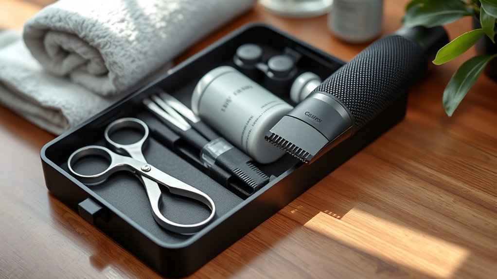 Choosing high-end men’s grooming kits starts with evaluating the quality of their tools, especially the materials used. Premium grooming tools are typically crafted from surgical-grade stainless steel or other corrosion-resistant metals, ensuring durability and maintaining hygiene over time. These materials are often hardened and polished, which enhances their sharpness and guarantees long-lasting performance. Rust-proof and anti-corrosion features are essential, especially since grooming tools frequently encounter moisture. High-quality materials also allow for ergonomic designs and textured grips, providing better control and safety during grooming. Investing in tools made from superior materials reduces the need for frequent replacements, making your kit more cost-effective in the long run. Ultimately, the right material quality ensures your grooming experience is precise, safe, and durable.