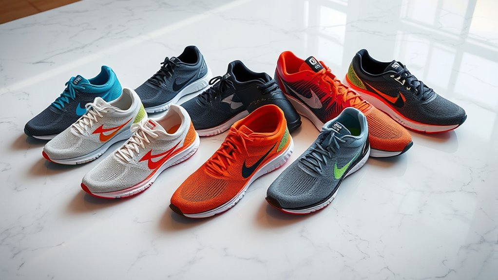 Lightweight shoes can make a significant difference in how efficiently you run, reducing fatigue and boosting agility. When shoes are lighter, I notice I can go longer without feeling exhausted, and my movements feel more responsive. High-end running shoes often use advanced materials like specialized foam and carbon plates that cut weight without sacrificing cushioning or stability. Responsiveness is equally important; shoes that quickly return energy help me accelerate and react faster during races or intense workouts. Many top models feature responsive midsoles that adapt to different foot strikes, providing a natural, springy feel. Striking the right balance between weight and responsiveness is vital to prevent injuries and maximize performance, especially when pushing through high-intensity runs.