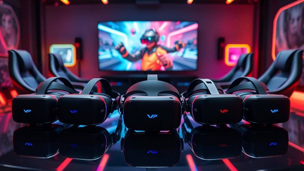 Immersive gameplay relies heavily on precise control and tracking systems that capture your movements accurately. High-end VR headsets use advanced inside-out tracking with multiple cameras or external sensors to guarantee smooth, responsive motion detection. This accuracy is essential for reducing latency and motion sickness, making the experience feel natural. Many headsets support six degrees of freedom (6DoF), allowing full spatial movement and orientation tracking, so you can walk, turn, and gesture freely. Premium controllers feature ergonomic designs with haptic feedback, adaptive triggers, and finger touch detection, boosting realism and immersion. Some headsets even incorporate eye tracking and facial expression sensors, enhancing interaction fidelity and emotional engagement. All these elements work together to create a seamless, lifelike gaming experience that keeps you fully immersed.