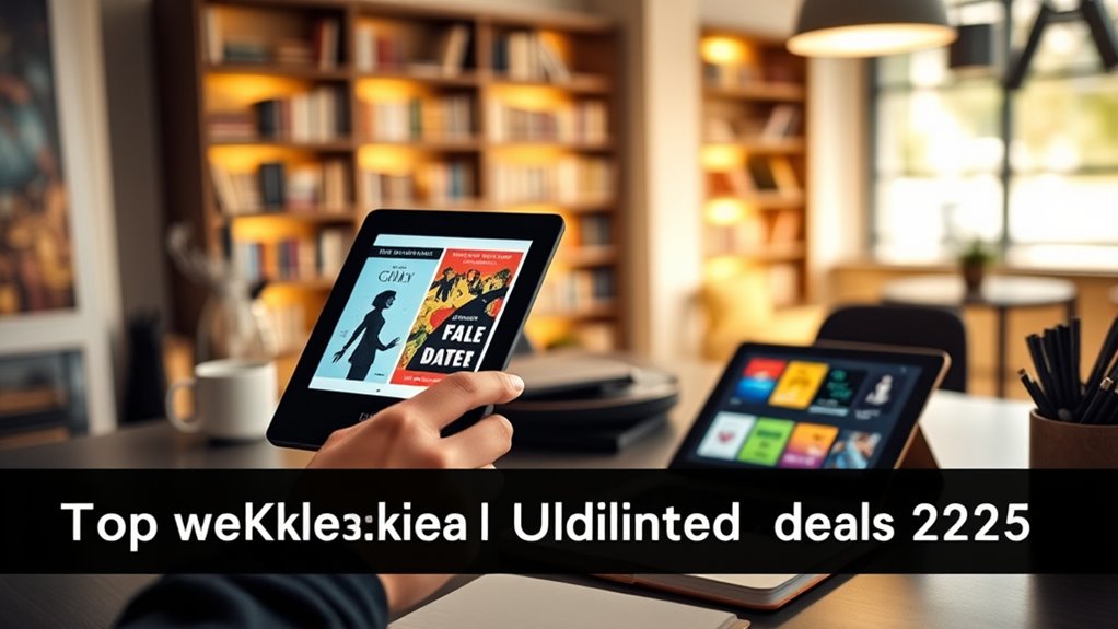 Taking advantage of promotional periods can substantially reduce your Kindle Unlimited costs, especially during holidays or special events when Amazon and publishers offer exclusive deals. These limited-time offers often include extended trial periods or discounted subscription fees, making it easier to explore the service without a full commitment. Publishers and Amazon periodically launch special campaigns that impact the availability and pricing, so timing is essential. Promotions are usually advertised in advance, so you need to act quickly to lock in the best deal. By planning your subscription around these promotional windows, you can maximize savings and enjoy longer access at a lower price. Keep an eye on Amazon’s announcements to guarantee you don’t miss out on these valuable opportunities.