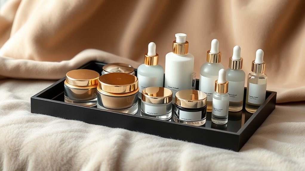 Choosing luxury and professional beauty products starts with scrutinizing their ingredient quality standards, which directly impact safety and effectiveness. High-quality ingredients are sourced from reputable suppliers and undergo rigorous testing for purity and safety, ensuring only the best make it into your products. Certifications like ISO and GMP adherence confirm that manufacturers maintain strict quality control benchmarks. Indicators such as organic, cruelty-free, vegan, and hypoallergenic labels show ingredients are ethically sourced and suitable for sensitive skin. The concentration and stability of active ingredients—like peptides, antioxidants, and retinoids—are carefully formulated to deliver maximum benefits. Transparency in ingredient lists and the avoidance of harmful substances like parabens, sulfates, and phthalates are key signs of high standards, giving you confidence in your skincare choices.