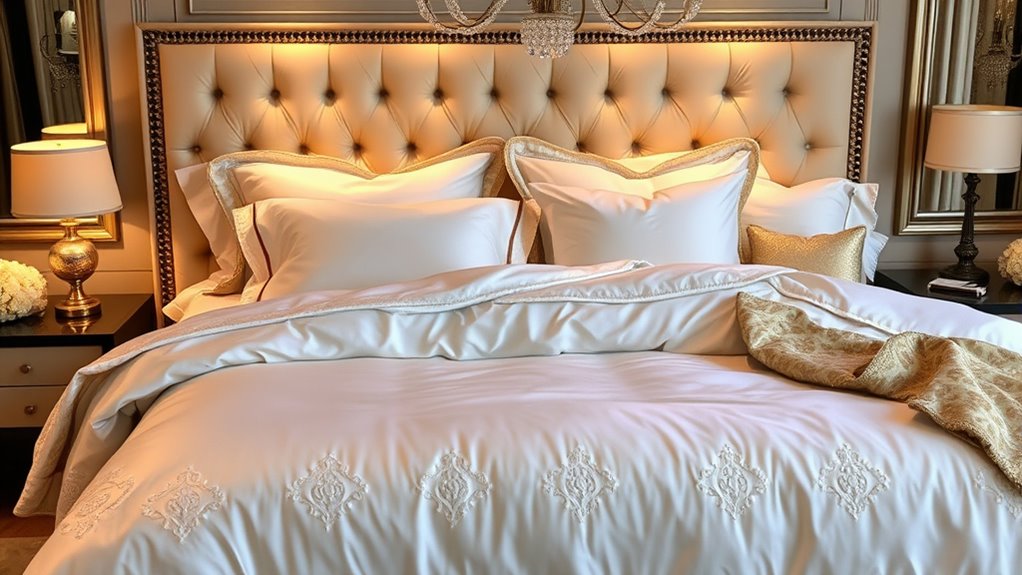 Caring for high-end bedding is like nurturing a fine wine—gentle handling makes all the difference. I always follow the care instructions, wash in cold water, and use gentle detergents to keep fabrics soft and vibrant. Avoid bleach and high heat, and fluff pillows regularly. By treating your bedding with care, you’ll guarantee it stays luxurious, fresh, and inviting for years to come.
