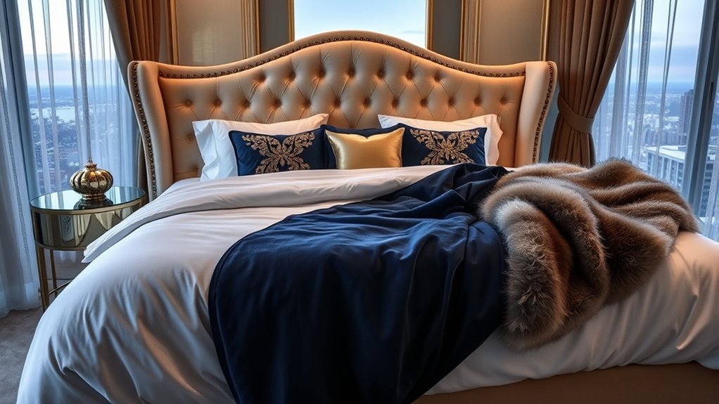 I’ve explored the top luxury bedding sets that can turn your bedroom into a 5-star retreat. These sets offer all-encompassing, coordinated pieces like comforters, sheets, shams, and decorative pillows, crafted from high-quality fabrics like Egyptian cotton, microfiber, and velvet for supreme softness and durability. They feature stunning patterns, rich textures, and deep pockets for a perfect fit. Keep going to discover the best options, tips, and what makes each set stand out for a luxurious upgrade.