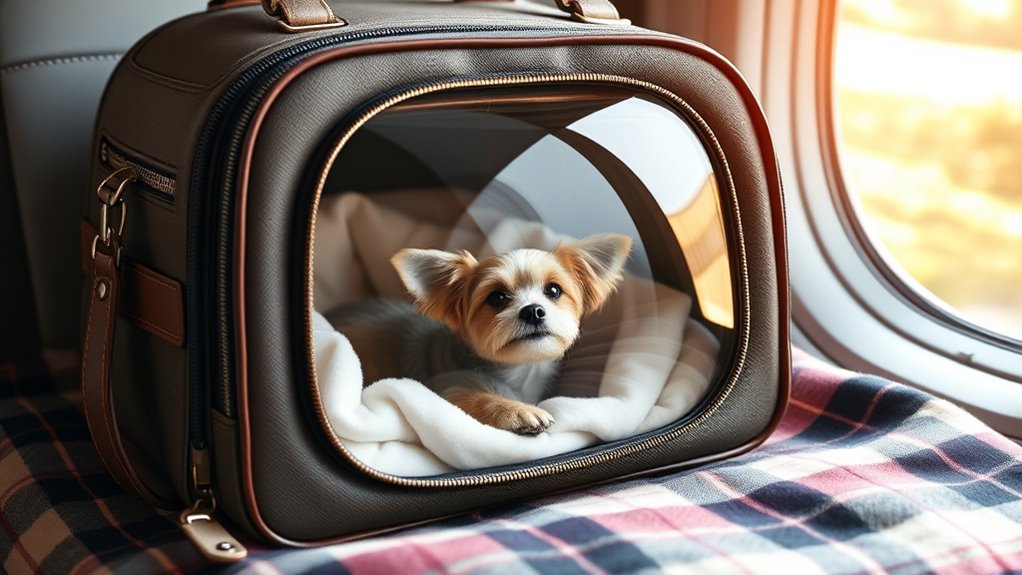 Ensuring your luxury dog carrier meets travel regulations is essential for a smooth journey. I always start by checking airline-specific size and weight restrictions for in-cabin travel, as these can vary. It’s also important to verify that the carrier is TSA-approved and complies with major airline safety and ventilation standards. Look for carriers with airline-approved labels or certification to avoid last-minute issues. Keep in mind, each airline may have different requirements for dimensions, materials, and security features, so I measure my pet and the carrier beforehand. This way, I prevent travel disruptions or refusal at the gate. Being thorough with these regulations guarantees a hassle-free trip, allowing my pet to travel comfortably and safely within the airline’s guidelines.